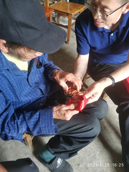 印象最深刻的是我們慰問的第一位老黨員——仁龍村黨支部的楊勝榮同志。剛踏入他家門的時候,楊勝榮同志竟第一時間叫出了我的名字,我在詫異之際又備受觸動。突然回想起來,他就是參加自己在仁龍村開展的黨史學習教育宣講遇到的那位老黨員。那一天,當我將“光榮在黨50年”紀念章交到他手上的時候,他臉上綻放了笑容,激動地說:“我黨齡已過50年,年齡已到90歲,我要把共產黨員的優(yōu)良傳統(tǒng)發(fā)揚下去!”這樸實無華的語言,是那么堅定、那么鏗鏘有力!