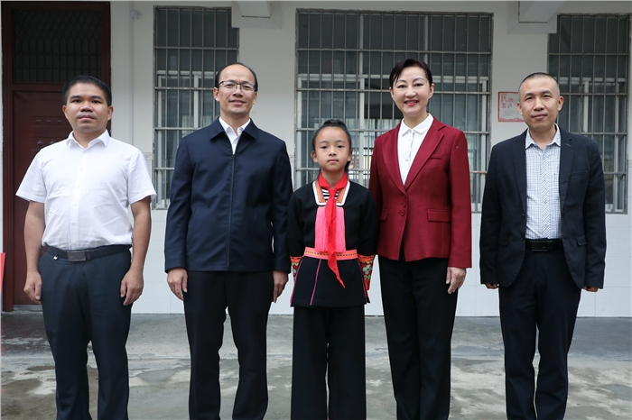 ▲李歷一行在覽金小學(xué)與學(xué)生代表盤淑娟合影