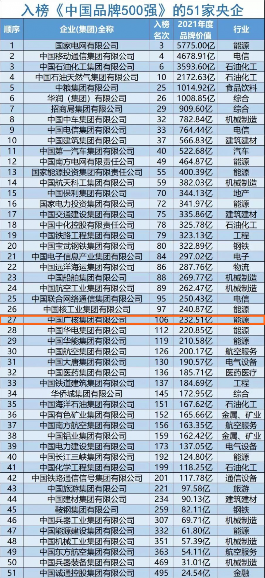 日前,2021中國品牌節(jié)第十五屆年會發(fā)布了《2021中國品牌500強》榜單。中國廣核集團有限公司以232.51億元的品牌價值入選中國品牌500強,排名第106名,在上榜的51家央企中排名第27位。