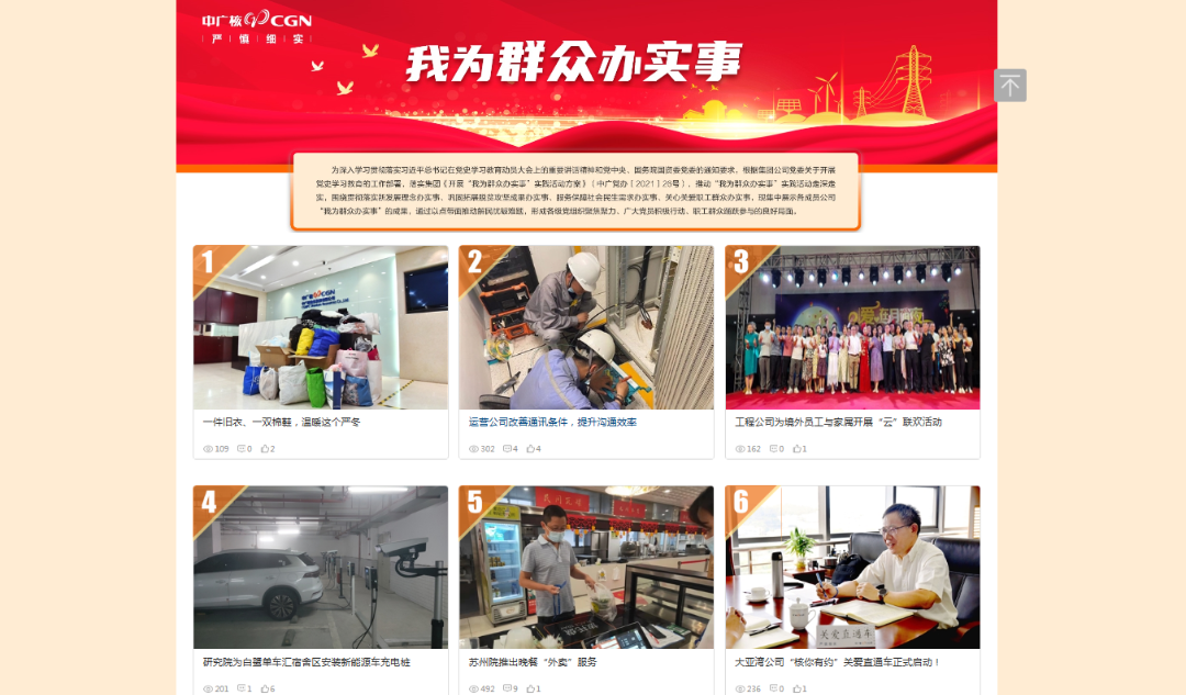 開設(shè)“我為群眾辦實事”專題網(wǎng)頁,曬辦實事成果。中廣核推出專題網(wǎng)頁,集中展示各單位“我為群眾辦實事”代表性成果,每月對成果進行滾動更新。通過各單位曬成果,接受群眾監(jiān)督、開展群眾評價,形成各級黨組織聚焦聚力、廣大黨員積極行動、員工群眾踴躍參與的良好局面。