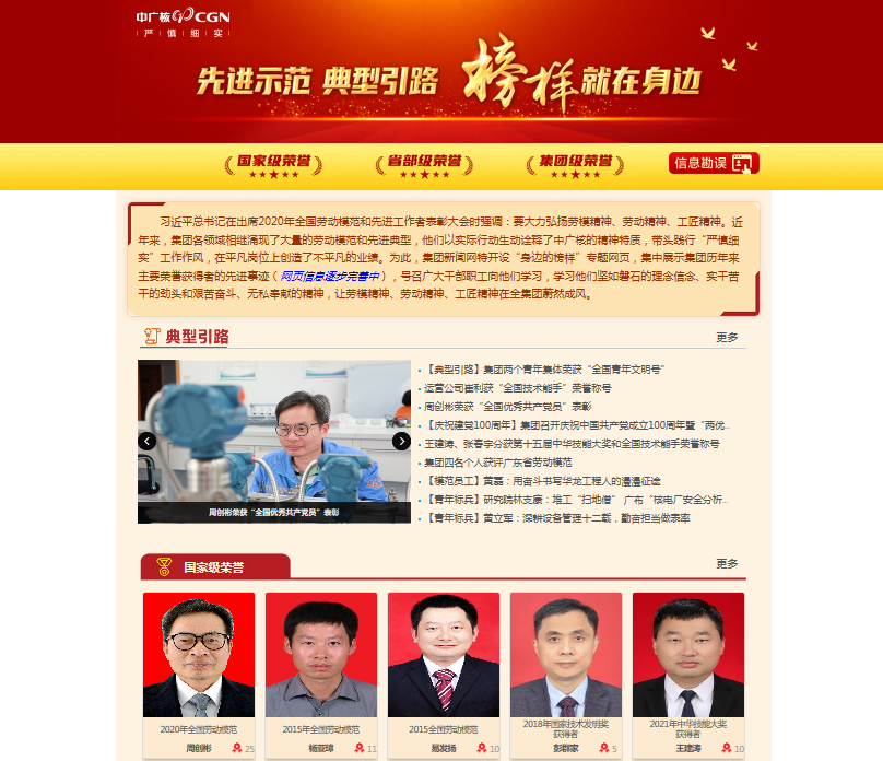 搭建“身邊的榜樣”專題網(wǎng)頁,傳播先進典型事跡。中廣核策劃推出“身邊的榜樣”專題網(wǎng)頁,按照國家級、省部級、集團級分類梳理建立個人榮譽檔案,集中展示先進典型的主要榮譽、工作經(jīng)歷、歷年獲獎情況、先進事跡、主要貢獻及相關(guān)事跡報道,以身邊榜樣的優(yōu)秀事跡,展現(xiàn)中廣核人的優(yōu)良傳統(tǒng),彰顯中廣核人的精神底色。