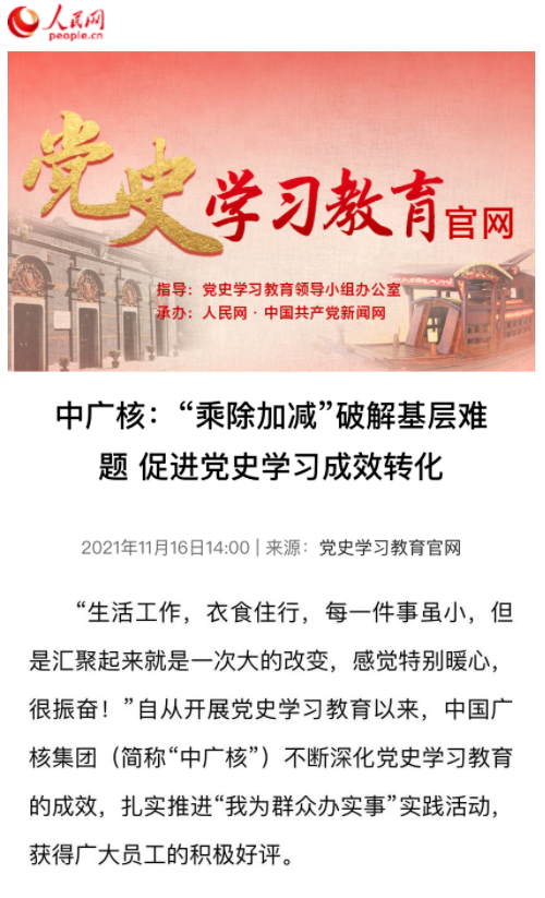 期間,中國廣核集團(簡稱“中廣核”)圍繞中心、服務大局,從乘、除、加、減四個方向持續深化黨史學習教育成效轉化,重點聚焦基層一線員工、科研人員、偏遠項目人員“急難愁盼”問題,用實際行動持續辦實事辦好事,大力營造攜手團結奮斗、共筑復興偉業的濃厚氛圍,強化思想引領、凝聚發展合力。