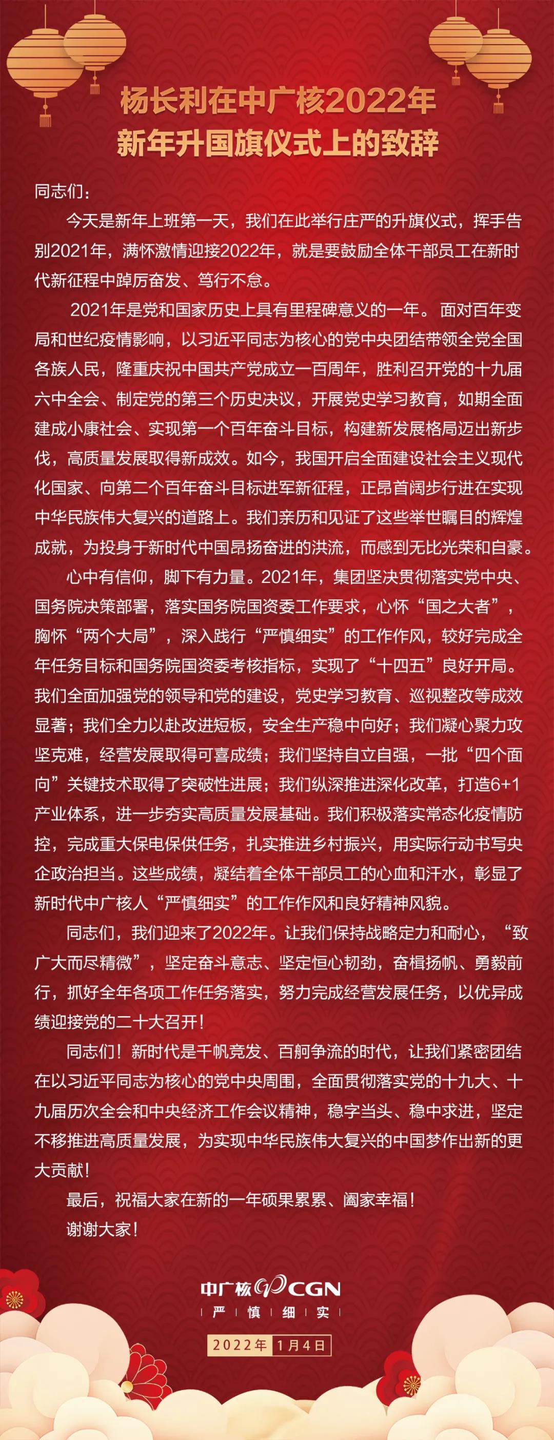 楊長利在致辭中指出,2021年是黨和國家歷史上具有里程碑意義的一年。面對百年變局和世紀疫情影響,以習近平同志為核心的黨中央團結帶領全黨全國各族人民,隆重慶祝中國共產黨成立一百周年,勝利召開黨的十九屆六中全會、制定黨的第三個歷史決議,開展黨史學習教育,如期全面建成小康社會、實現第一個百年奮斗目標,構建新發展格局邁出新步伐,高質量發展取得新成效,開啟全面建設社會主義現代化國家、向第二個百年奮斗目標進軍新征程,正昂首闊步行進在實現中華民族偉大復興的道路上。中廣核人親歷和見證了這些舉世矚目的輝煌成就,為投身于新時代中國昂揚奮進的洪流,而感到無比光榮和自豪。