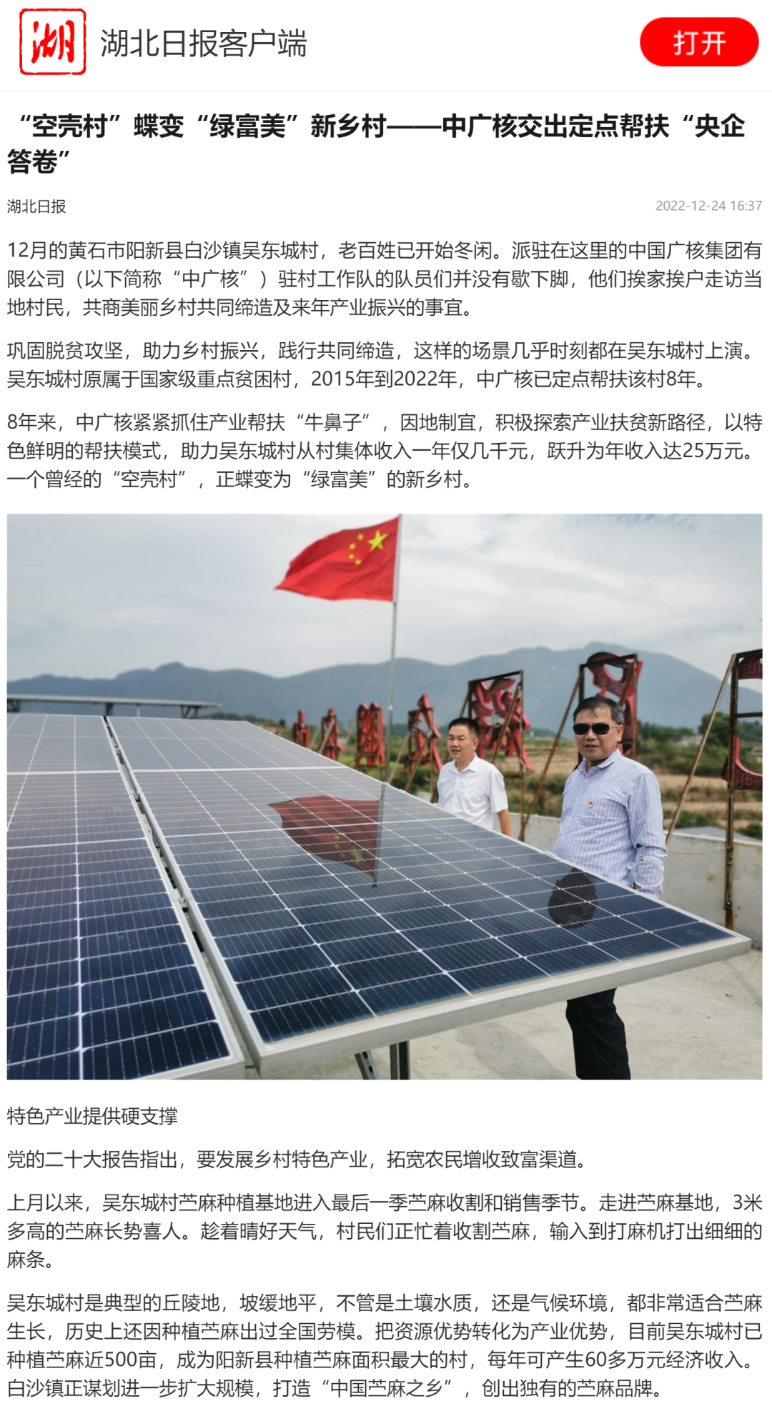 近日,湖北日報聚焦報道,中國廣核集團從2015年到2022年定點幫扶湖北省黃石市陽新縣白沙鎮(zhèn)吳東城村,積極探索產(chǎn)業(yè)扶貧新路徑,以特色鮮明的幫扶模式助力吳東城村脫貧攻堅,從“空殼村”變成“綠富美”新鄉(xiāng)村。