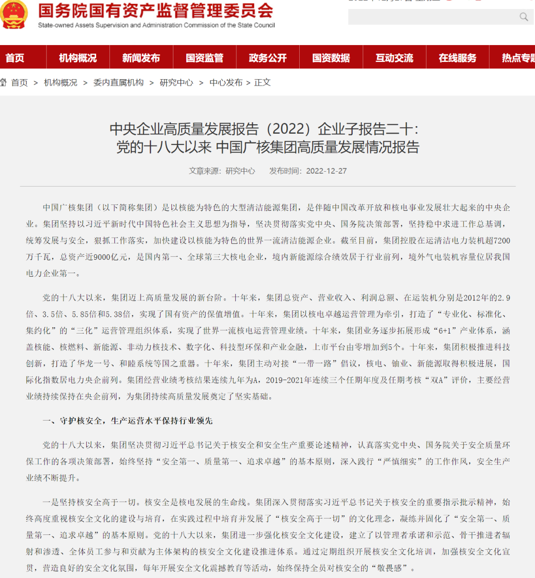 12月27日,國務院國資委官網刊發黨的十八大以來中國廣核集團高質量發展情況報告,報告從多個角度展示中廣核近十年的成績和發展,聚焦安全生產、科技創新、產業布局、深化改革、黨的建設、社會責任等方面,展現中廣核持續推動高質量發展,加快建設世界一流企業的穩健步伐。