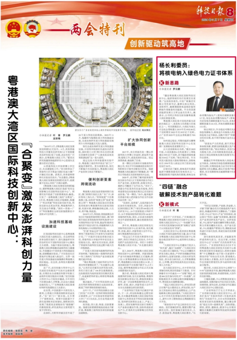 “建設粵港澳大灣區國際科技創新中心,能源領域的先行發展至關重要。”全國政協委員,中國廣核集團有限公司黨委書記、董事長楊長利說。連續兩年,他都圍繞核電戰略價值和積極作用準備相關提案。作為我國清潔能源發展主力軍企業的負責人,他表示,公司將以科技創新助推粵港澳大灣區核能發展。