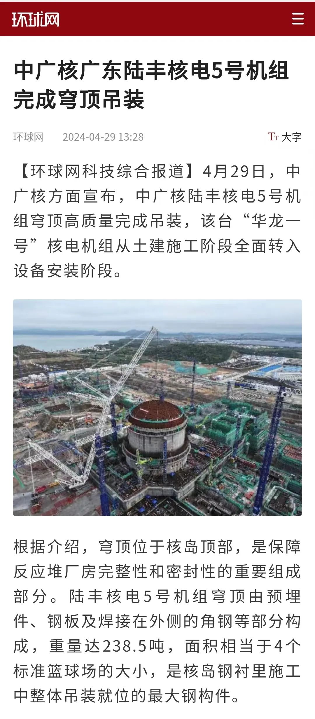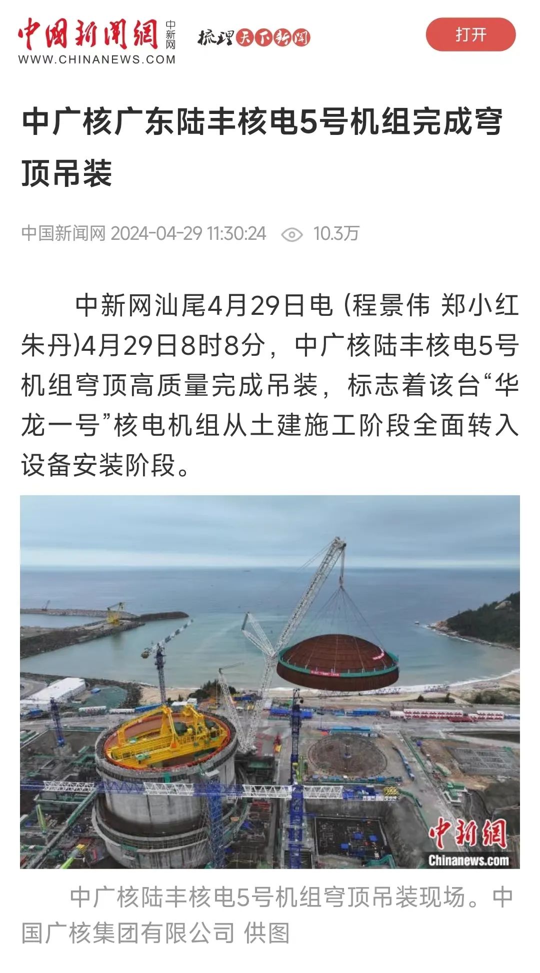 4月29日8時8分,中廣核廣東陸豐核電項目5號機組穹頂完成吊裝,標志著該臺“華龍一號”核電機組從土建施工階段全面轉入設備安裝階段。人民日報、新華社、央視等多家主流媒體對此進行聚焦報道。