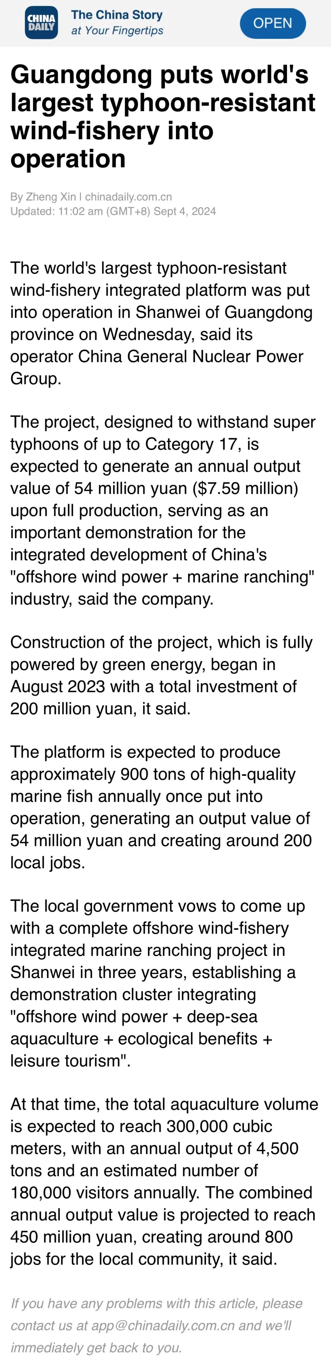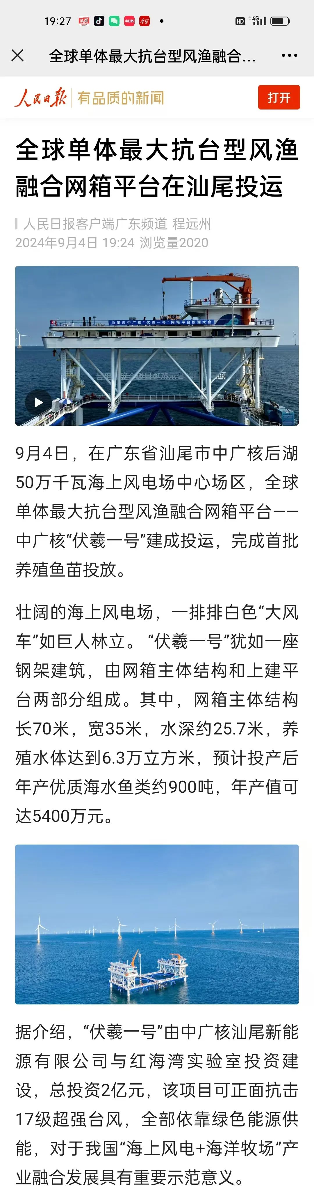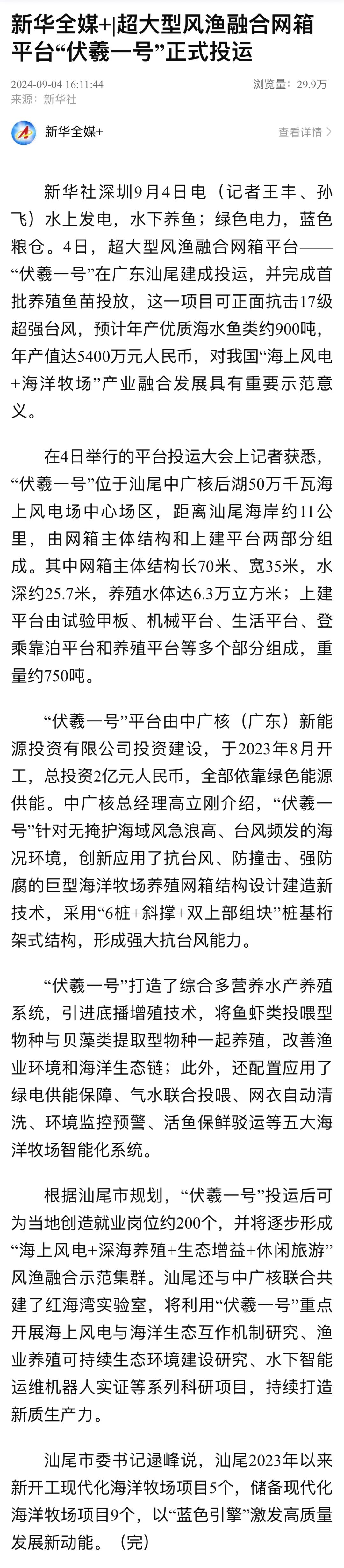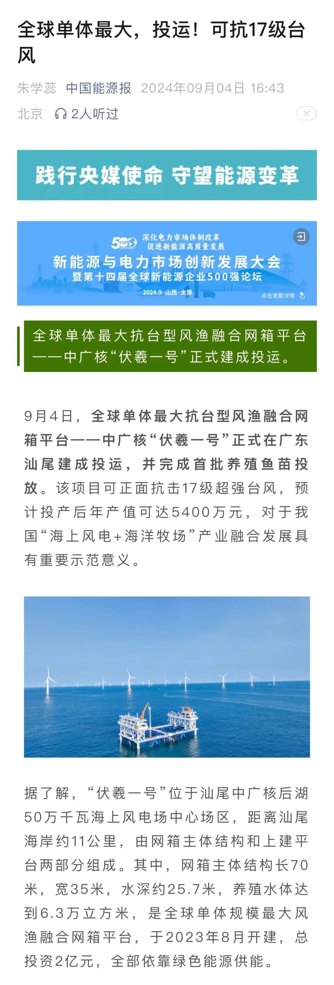 9月4日,中廣核汕尾“伏羲一號(hào)”風(fēng)漁融合項(xiàng)目正式投運(yùn),并完成首批養(yǎng)殖魚苗投放,該項(xiàng)目可正面抗擊17級(jí)超強(qiáng)臺(tái)風(fēng),預(yù)計(jì)投產(chǎn)后年產(chǎn)值可達(dá)5400萬元,對(duì)于我國(guó)“海上風(fēng)電+海洋牧場(chǎng)”產(chǎn)業(yè)融合發(fā)展具有重要示范意義。人民日?qǐng)?bào)、新華社、央視等數(shù)十家主流媒體對(duì)此進(jìn)行聚焦報(bào)道。